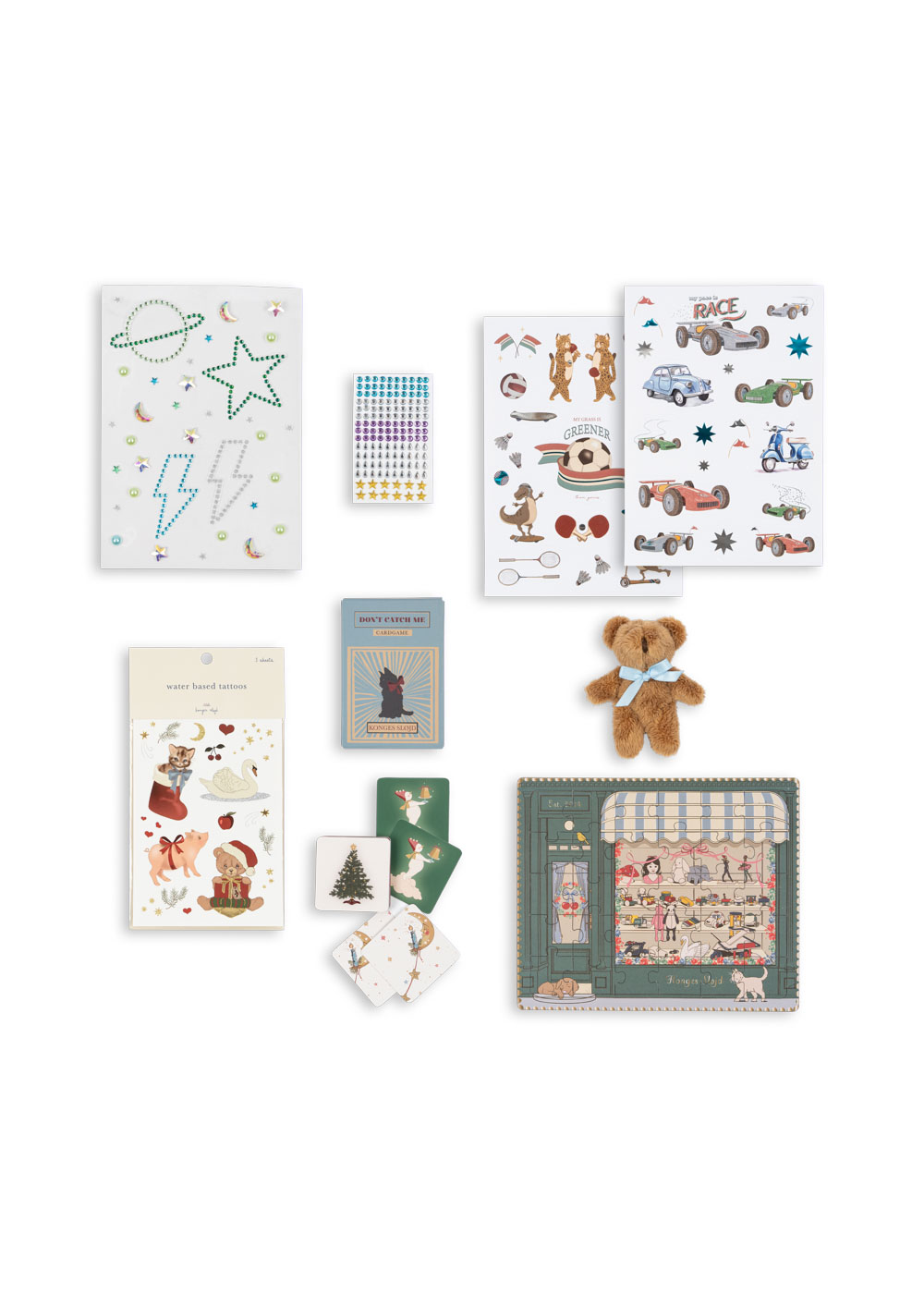 Der Kalender enthält: – 1 x Weihnachtstattoos – 1 x kleiner Teddybär – 1 x Aktivitätsbuch mit 20 Seiten – 1 x 12 Stück Metallic-Buntstifte – 1 x Kaleidoskop – 1 x Zauberfeder – 2 x Tattoo-Stifte + Schablonen – 2 x Stickerbögen – 1 x Kreisel – 1 x Kartenspiel (Black Cat) – 1 x Springball – 1 x Mini-Memory-Spiel (30 Stück) – 1 x Fensteraufkleber (2 Bögen) – 1 x Fahrradklingel – 1 x Malbuch (A5, 20 Seiten) – 1 x Stempel – 1 x Dekoration – Edelsteine (nicht für den Körper) – 4 x Zauberstifte – 1 x Notizblock – 1 x Minipuzzle – 1 x Fensterstifte (zwei Stifte) – 1 x Lineal – 2 x Glitzerstifte – 1 x Blatt mit Edelsteinen (für den Körper)