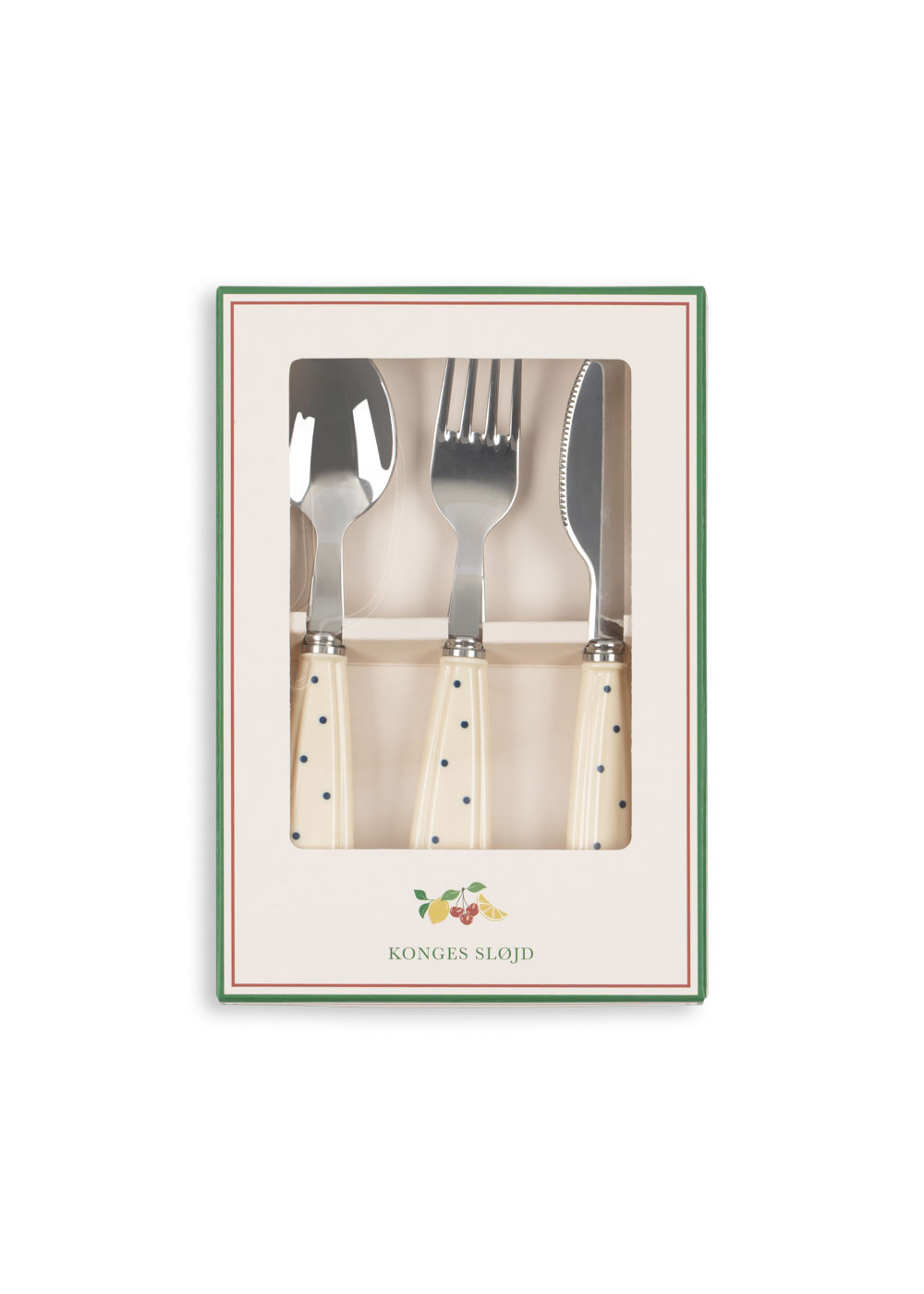 Praktisches Besteckset mit süßem Konges Sløjd-Signatur-Kirschdruck und gewellter Form. Das Set aus Edelstahl umfasst drei Teile.